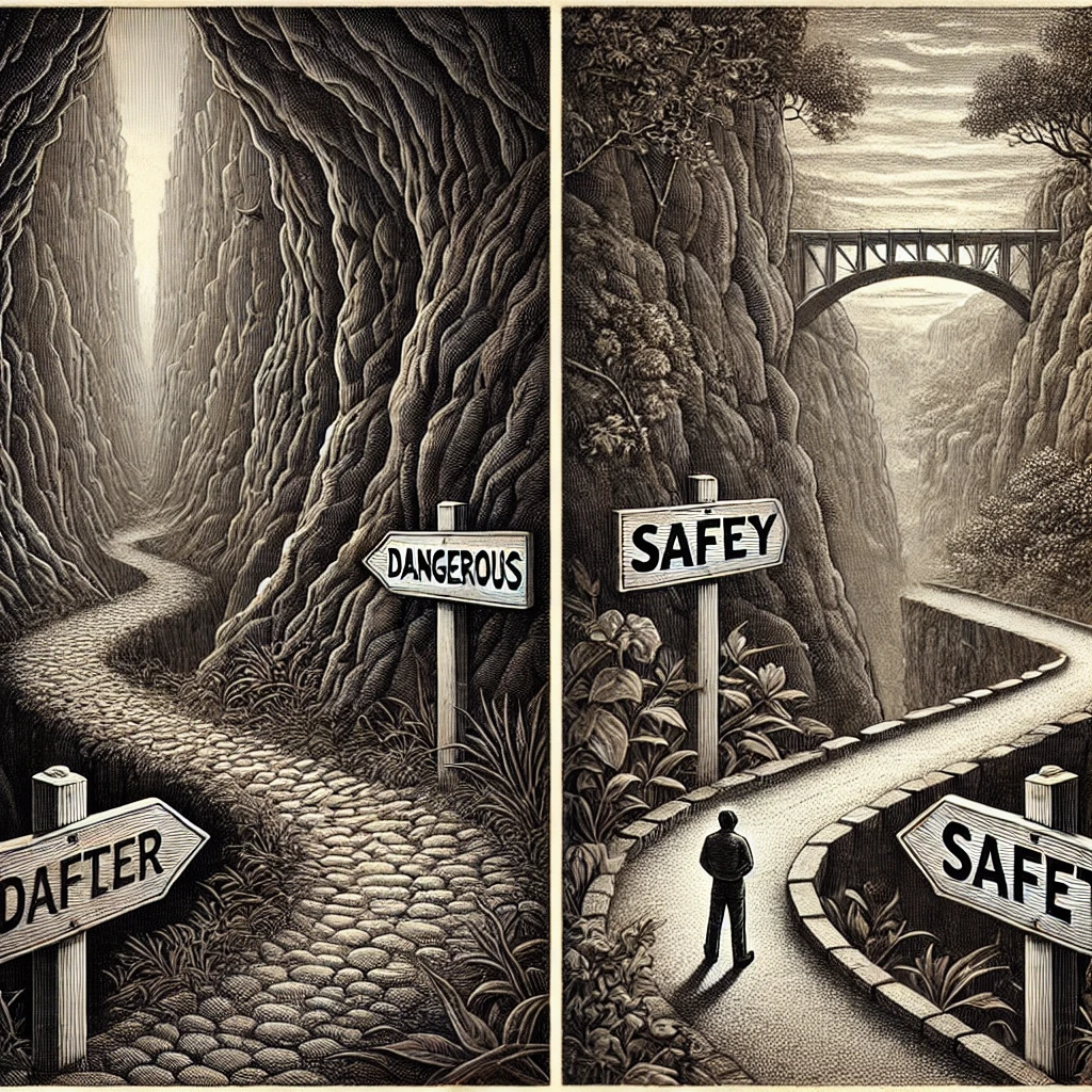 위의 이미지는 챗gpt로 그린 그림이며 위험한 길과 안전한 길, 우회로와 지름길에서 인생이 무엇을 선택해야 할지에 대한 이미지입니다.