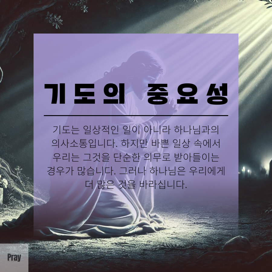 기도의 중요성 기도는 일상적인 일이 아니라 하나님과의 의사소통입니다. 하지만 바쁜 일상 속에서 우리는 그것을 단순한 의무로 받아들이는 경우가 많습니다. 그러나 하나님은 우리에게 더 많